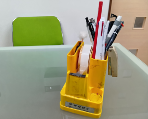 右側はペン立て、右側手前はクリップや消しゴムを置けて、これ一台で完結!
